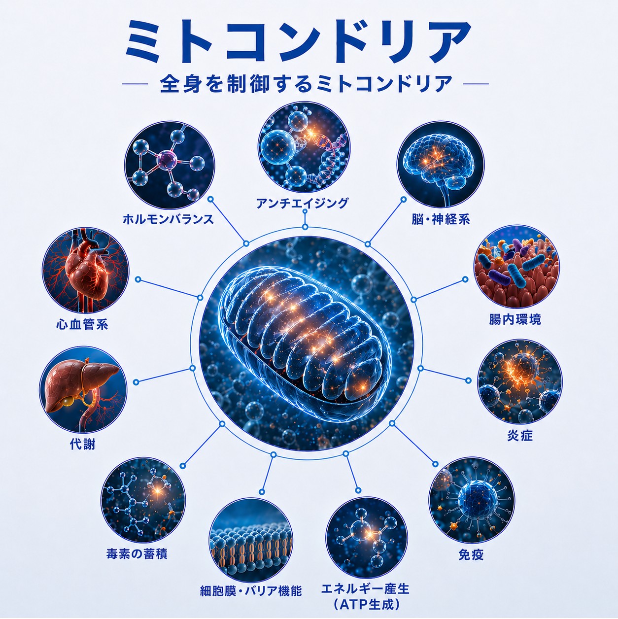 病気と美とアンチエイジングの分野でミトコンドリアのアプローチは外せません。ざっくり見るだけでも、エネルギー、脳の健康、炎症、免疫、心血管の健康、肝臓、骨格筋、癌克服、組織再生、解毒、代謝、腸内環境、ホルモンバランスなどに、ミトコンドリアが関わるのです。