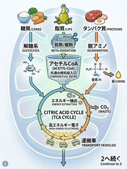 エネルギーの燃料である、栄養素と酸素は、まず燃料(3大栄養素と酸素)は、体内の消化や血液循環を経てミトコンドリアに届きます。そしてクエン酸回路という名の代謝回路に入って、発電前の準備が始まります。