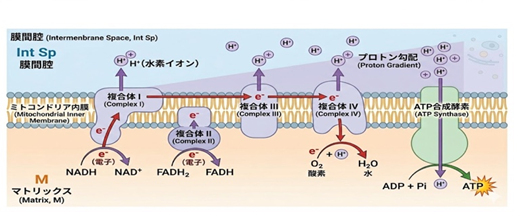 作成したエネルギーは最終的に発電されます。エネルギーを送り出す仕組みは、ETCという名前の電子モーターが担います。ETCはelectron transporting chainの略で、電子伝達系という意味です。ETCは4工程の流れ作業を経て、5番目で最終納品です。